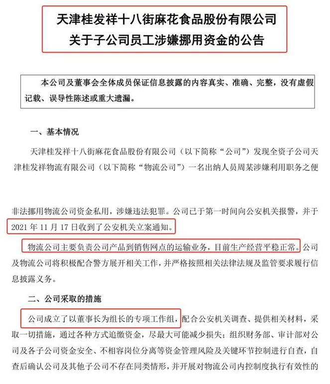日前,桂发祥公告自曝家丑:其全资子公司出纳将约1000万元挪用,目前公司正全力追缴,并于2021年11月17日报警,同时收到了公安机关立案通知。